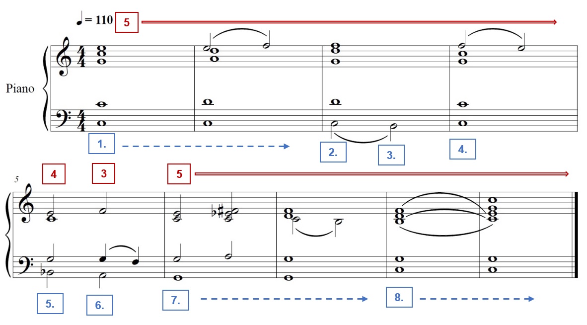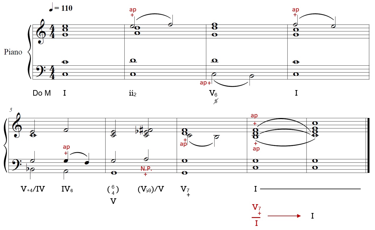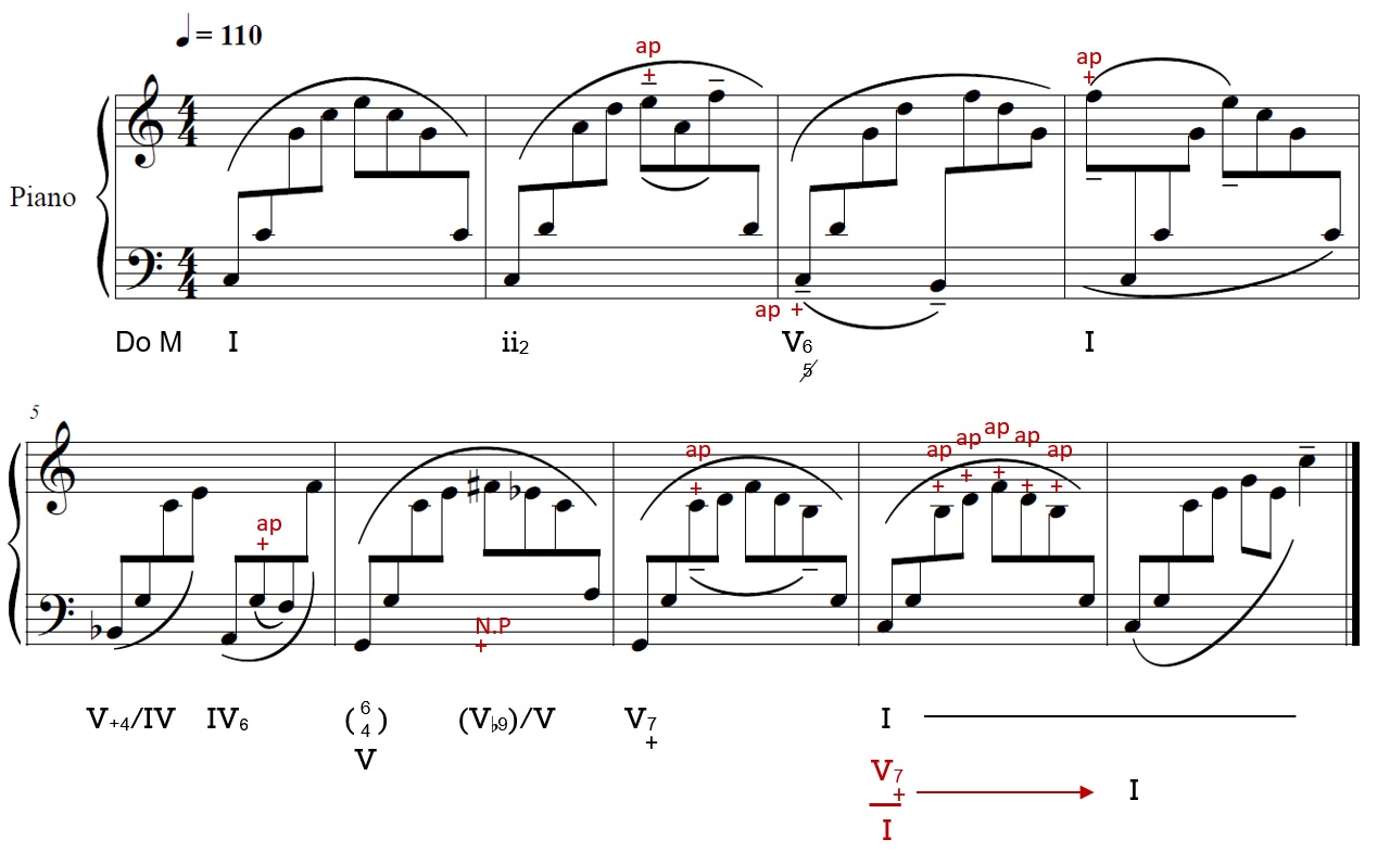 L’únic aspecte que podria tenir diferents interpretacions seria el que trobem en el 8è compàs. En alguns centres, quan un acord de Dominant es genera sobre la primera nota de l’escala de la tonalitat principal que prèviament venia de resoldre saltant per 5a Justa descendent o 4a Justa ascendent un acord de Dominant, li diuen “Acord de Sobretònica”. Des de MusicAccess no som partidaris d’aquesta interpretació, perquè en essència, les notes de les tres veus superiors del 8è compàs es comporten com appoggiatures que resolen dins el mateix acord de Do M, 1r grau de Do Major.