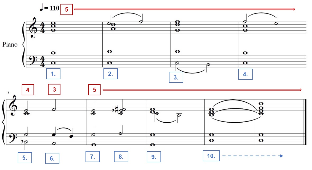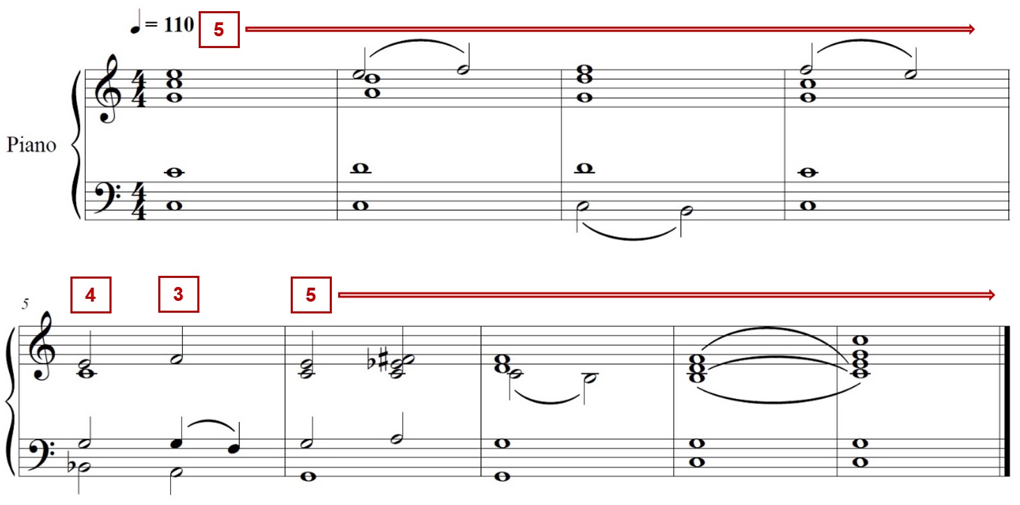 El primer desajust el trobem en el 2n compàs, on sí que és veritat que la línia del Baix no és mou, però la resta de veus superiors sí, determinant les notes esquelet de l’acord. Per tant, estem obligats a ressituar el Do2 del Baix respecte la resta veus. El mateix passa en el 3r compàs. Si la resta de veus superiors acaben creant un nou acord amb una extensió de rodona, el Do2 i el Si1 del Baix hauran d’entrar-hi, un com a nota real i l’altre com a estranya. I el següent error el trobaríem en els compassos 6 i 7, motivats pel mateix factor. Malgrat la línia del Baix no es mou, el moviment amb notes reals de la resta de veus superiors no concorda amb la nota del Baix. Per aquest motiu, serà necessari canviar l’acord en el 3r temps del 6è compàs i la caiguda del 7è compàs. En definitiva, el ritme harmònic d’aquest fragment esdevindrà el següent: