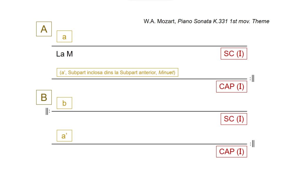 Las Partes y Subpartes son los dos elementos propios de la estructura. En primer lugar, nos centraremos en asignar una letra a cada Subparte en función del material temático que presenten. La nomenclatura que utilizaremos para cifrar cada Subparte serán letras minúsculas siguiendo el orden del abecedario. Si dos frases presentan las mismas características respecto a las 7 variables musicales, las cifraremos con una «a» cada una. Si dos Subpartes presentan ciertas diferencias en alguna de las 7 variables musicales pero características idénticas en el resto de variables, cifraremos con una en la primera frase y una «a» o «a1» la segunda. Existen dos posibilidades, utilizar las comas o también llamadas prima (a’, a’’, a’’’, etc.) o bien subíndices con números (a1, a2, a3, etc.). Por último, si dos frases difieren en dos o más variables, cifraremos la primera Subparto con una «a» y la segunda con una «b».